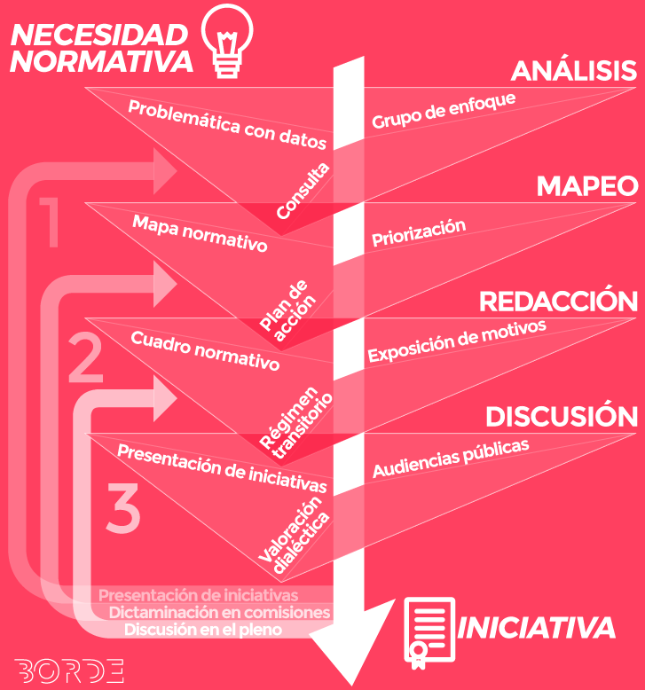 Desde 2019 el equipo de BORDE colaboró en la implementación de metodologías de co-creación a lo largo del Proceso Nacional de Armonización Normativa en materia de movilidad, mismo que concluye con un nutrido grupo de reformas a nivel local y que desencadena la aprobación de la reforma constitucional que eleva a rango constitucional el derecho a la movilidad en condiciones de seguridad vial, accesibilidad, eficiencia, sostenibilidad, calidad, inclusión e igualdad. De esta reforma se desprende la necesidad de redactar la Ley General de Movilidad y seguridad vial que promete ser el punto de partida para un nuevo proceso de armonización e implementación a nivel nacional.